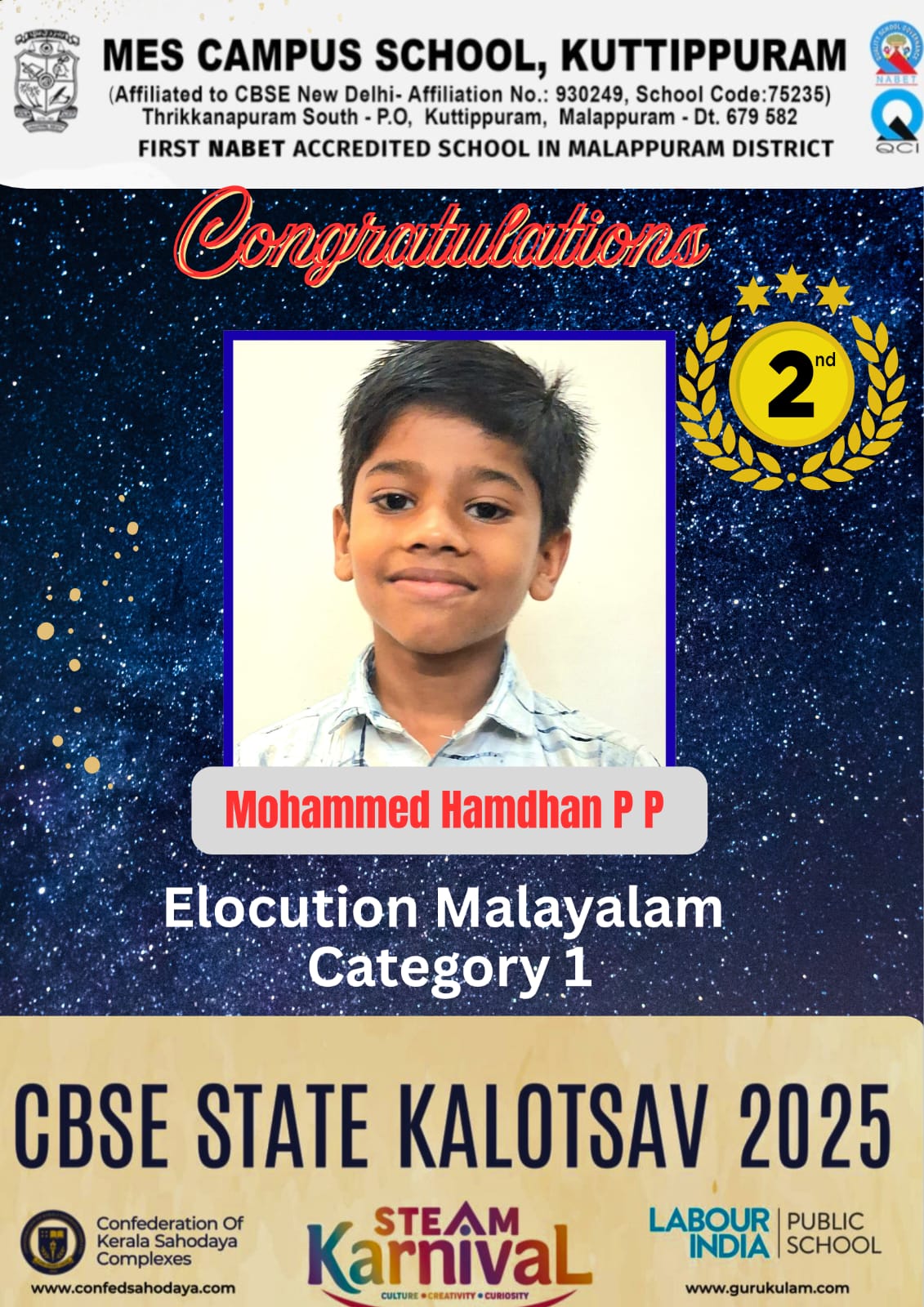 The CBSE State Kalotsav was held from November 12 to 15 at Labour India Public School, Kottayam. A total of 29 students participated from our school, showcasing their talents across various events. We are proud to note that most of the participants secured A Grade for their performances. Notably, Devadutt S. Krishna of Class XII achieved First Prize in Digital Painting (Category 4), and Mohammed Hamdhan P. P. of Class IV won Second Prize in Malayalam Elocution (Category 1). Their accomplishments stand as a testament to their hard work and creativity, bringing pride to the entire school.